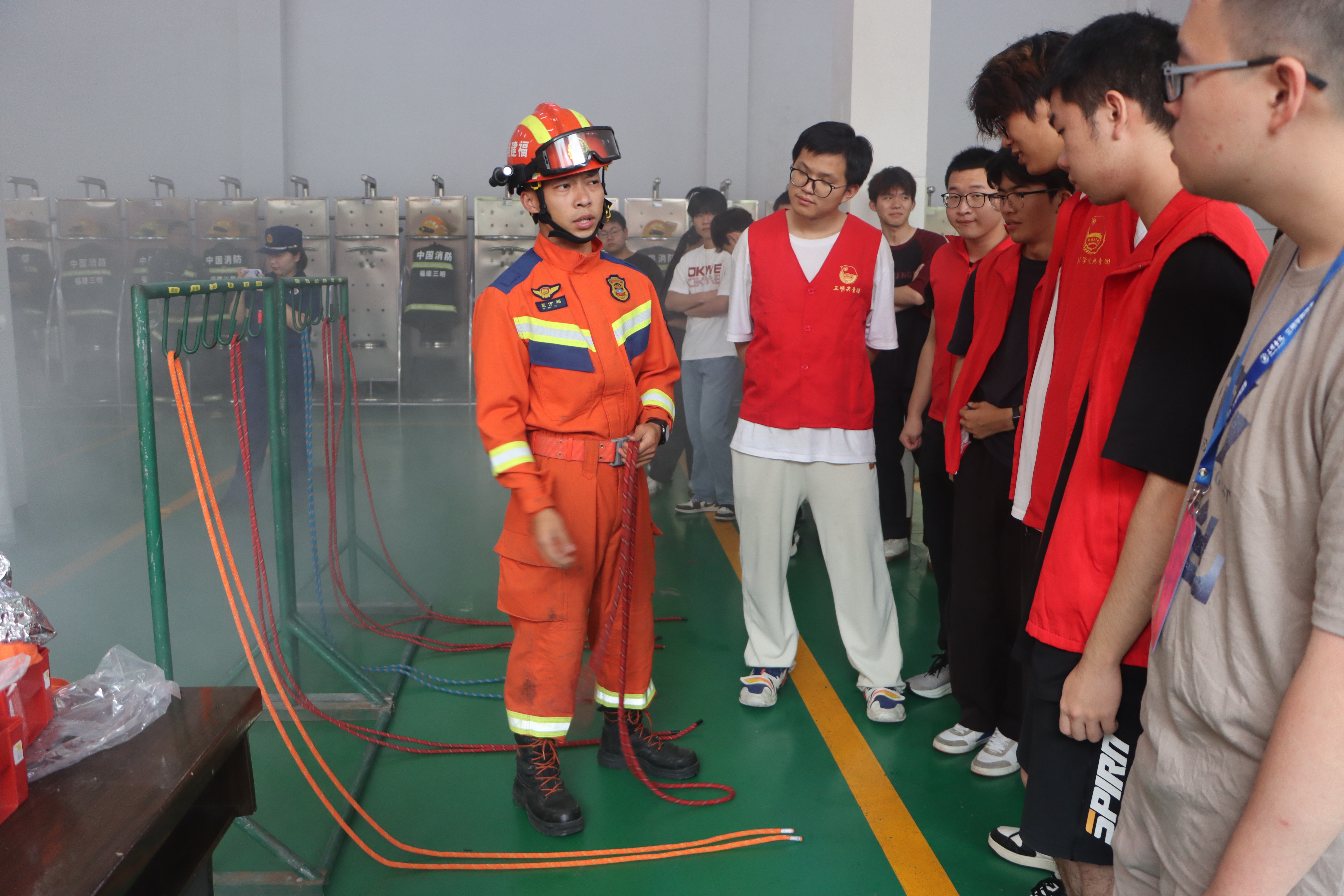 在实践环节,师生们走进车库和器材库,近距离了解各类消防车辆及专业救援装备的功能与用途。消防员现场演示并指导师生们穿戴消防战斗服、使用灭火器进行模拟灭火操作。一名参与活动的学生感慨道:”这次活动让我对消防员有了全新的认识,他们的英勇背后是无数次的训练和付出。”