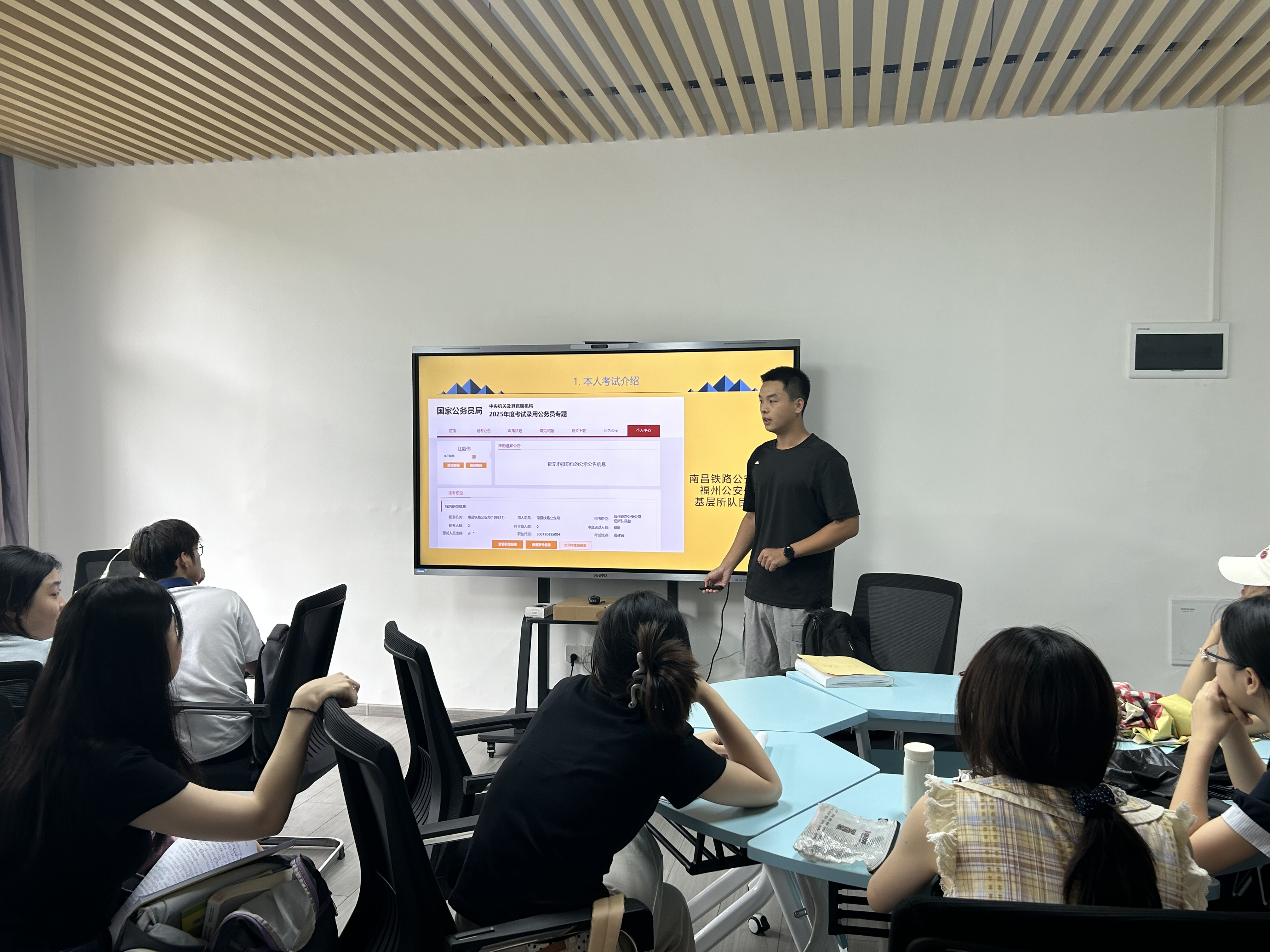 成功考取福州铁路公安岗位的江毅伟同学结合自身备考经历,从岗位选择、笔试策略、面试技巧、体能训练及心理调适等方面展开详细讲解,强调“目标规划”与“坚持执行”的重要性。他提到:“考公不仅是知识储备的比拼,更是心态和毅力的考验。要善于分析自身优势,把握政策动向,在备考中做到有的放矢。”互动环节中,同学们围绕备考时间管理、岗位竞争等实际问题积极提问,江毅伟逐一解答。