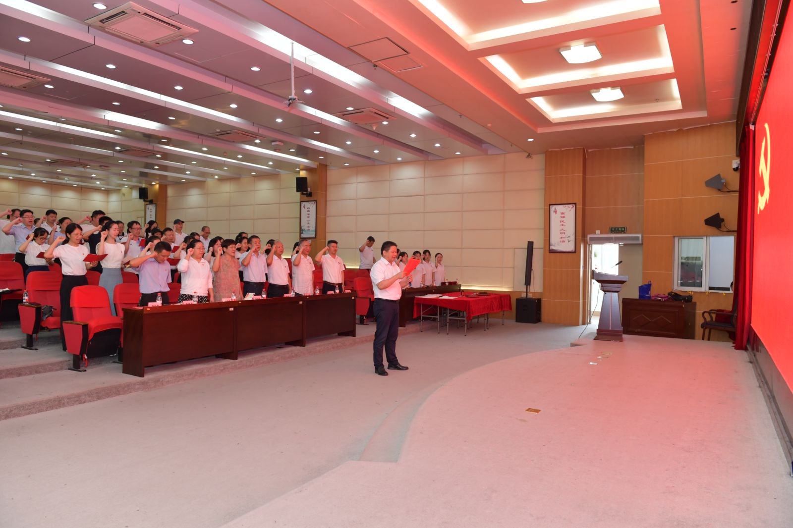 活动在图书馆党支部书记对“7月1日作为党的诞生纪念日”的历史解读中拉开帷幕。全体党员集中观看专题短片《我的入党志愿书》第一集《永不褪色的赤子心》,跟随老一辈共产党员的入党故事,感悟跨越时空的赤诚初心。随后,五个党支部书记依次为所在支部党员颁发“政治生日贺卡”,一张卡片、一声祝福,让党员们在仪式中重温入党时的庄严承诺。组团党龄最长的张梅华同志为新党员江丽君郑重佩戴党徽,“老带新”的温暖传承,让红色基因在代际传递中愈发鲜活。在组团召集人赖祥亮处长的领誓下,全体党员面向党旗庄严宣誓,铿锵有力的誓言响彻会场,彰显着党员队伍“红心向党、永远跟党走”的坚定信念。