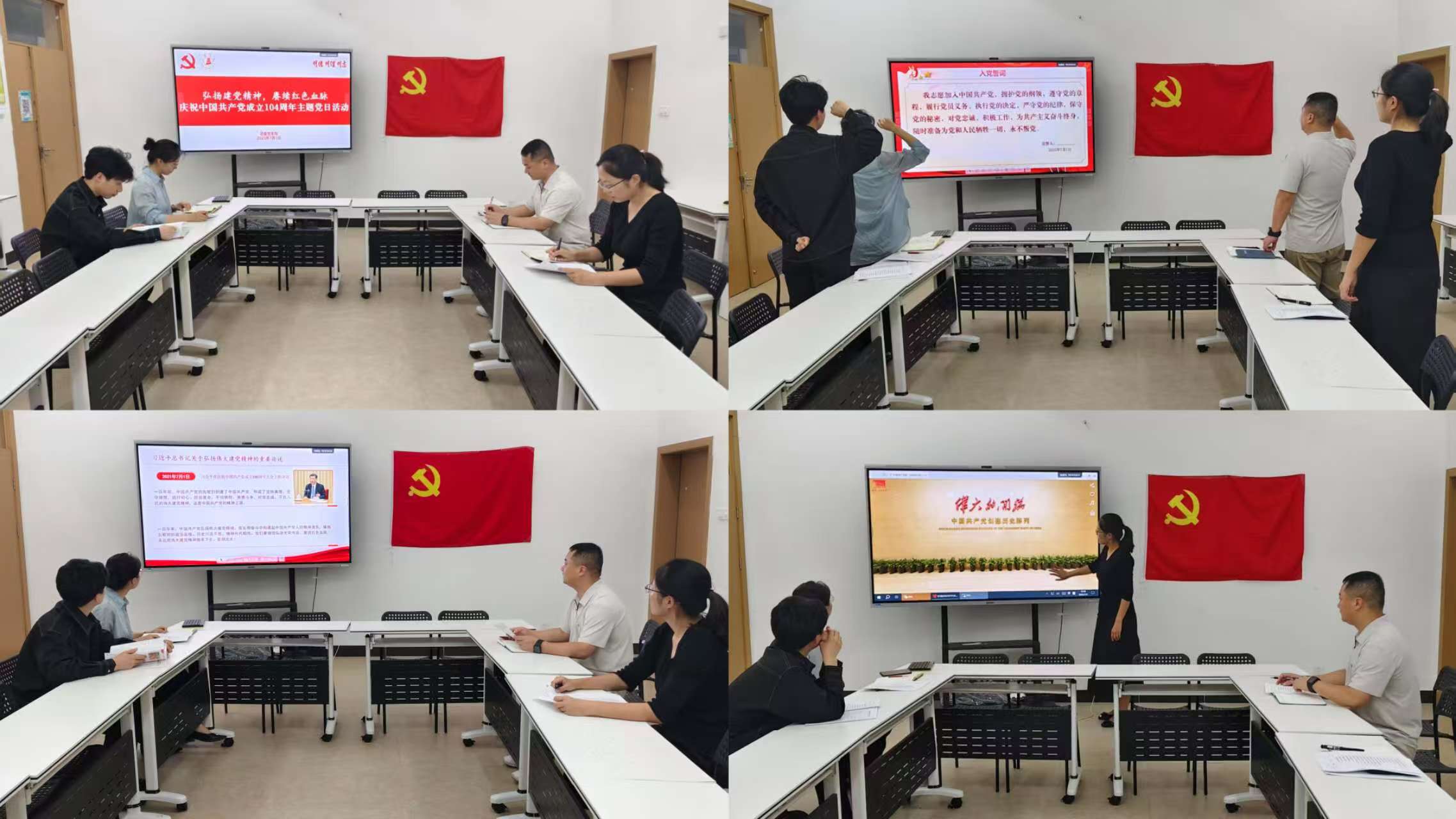 为庆祝中国共产党成立104周年,传承红色基因,凝聚奋进力量,校团委党支部于7月1日上午在南区学生活动中心组织开展“弘扬建党精神 赓续红色血脉”庆祝中国共产党成立104周年主题党日活动,通过理论学习、沉浸式宣讲、云端实践、专题研讨、仪式教育等多元形式,激发党员教师的使命担当。