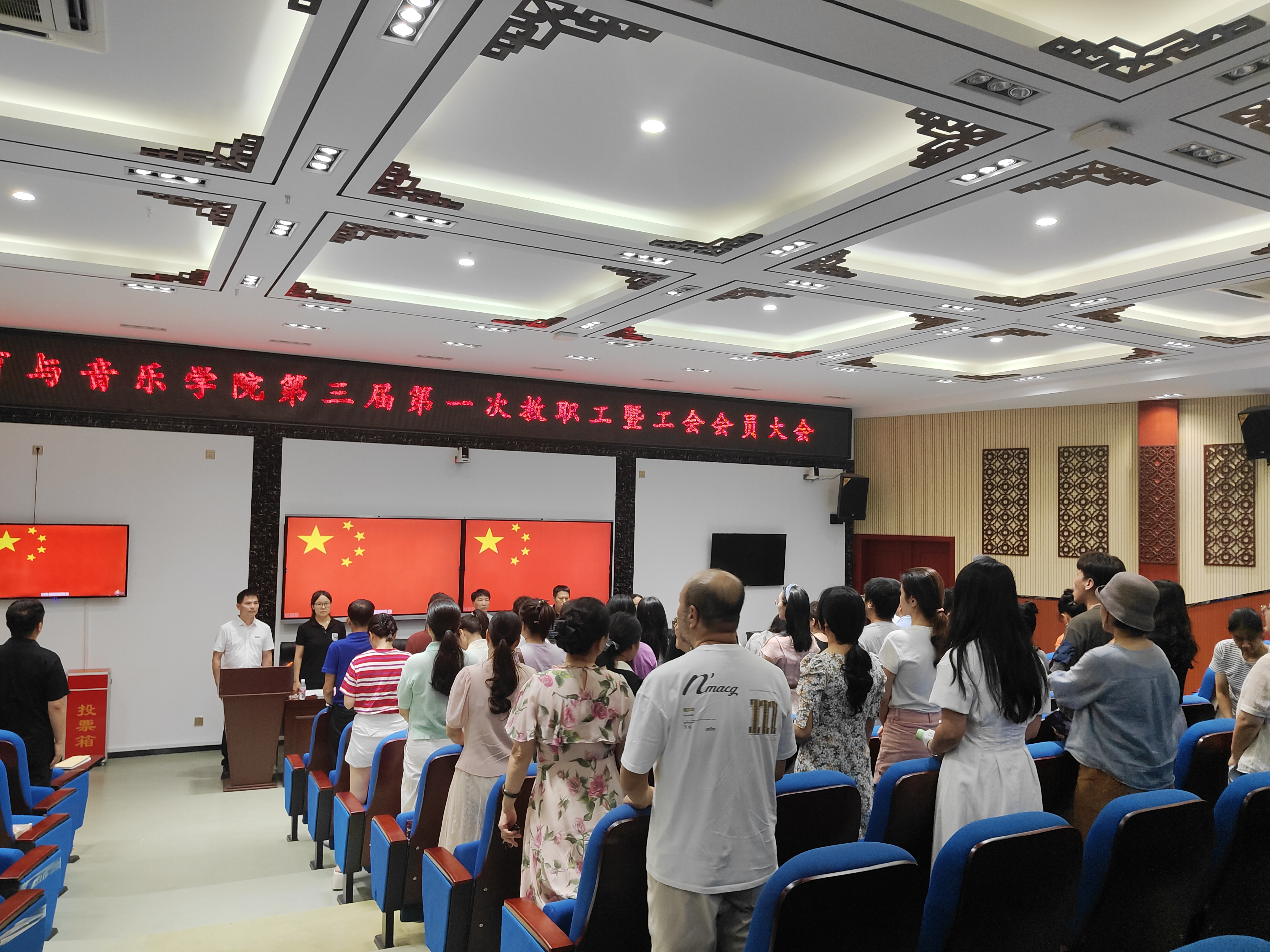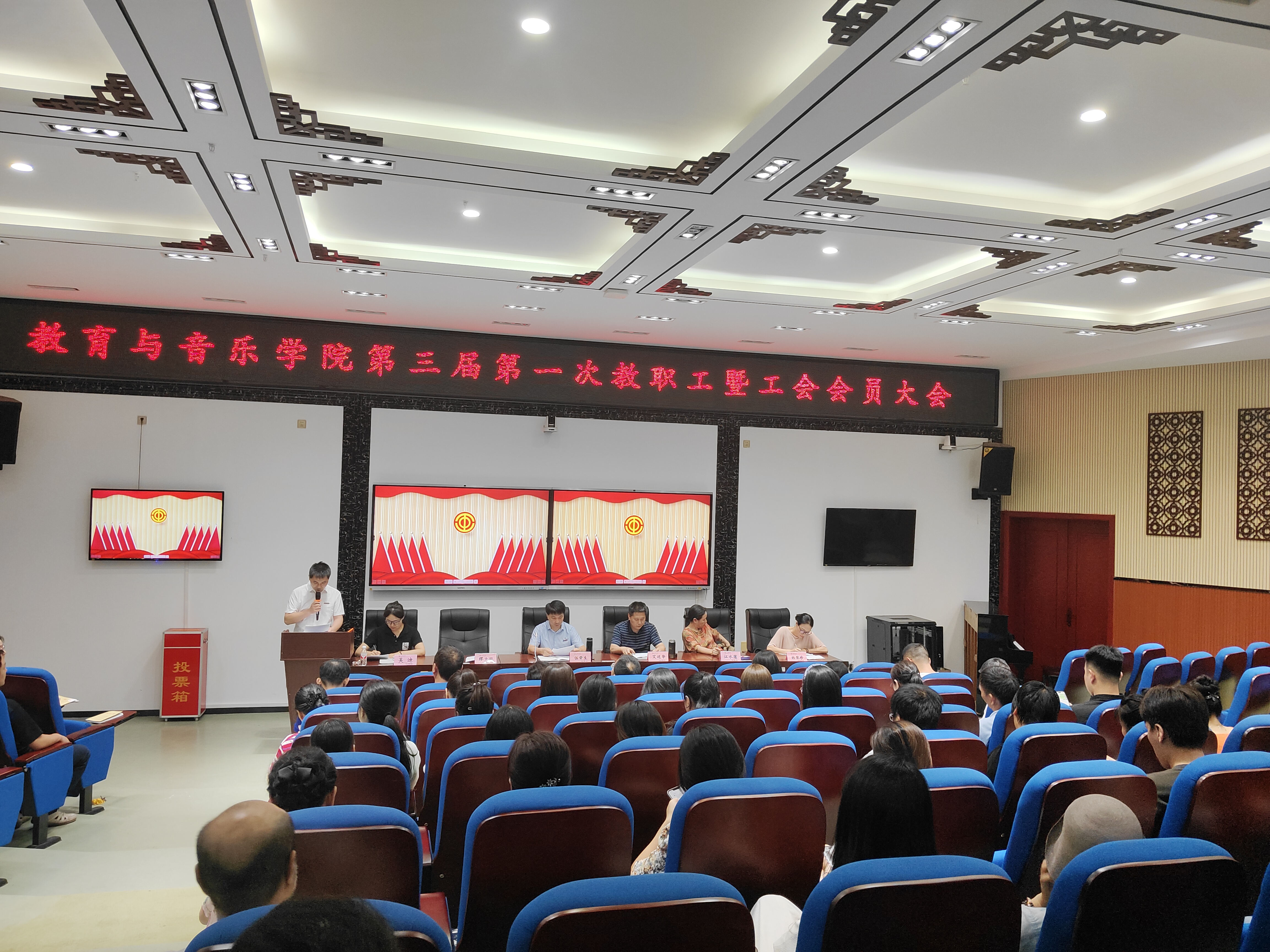 7月2日下午,教育与音乐学院于靖远楼101报告厅召开第三届第一次教职工暨工会会员大会,学院全体工会会员参加了本次会议。