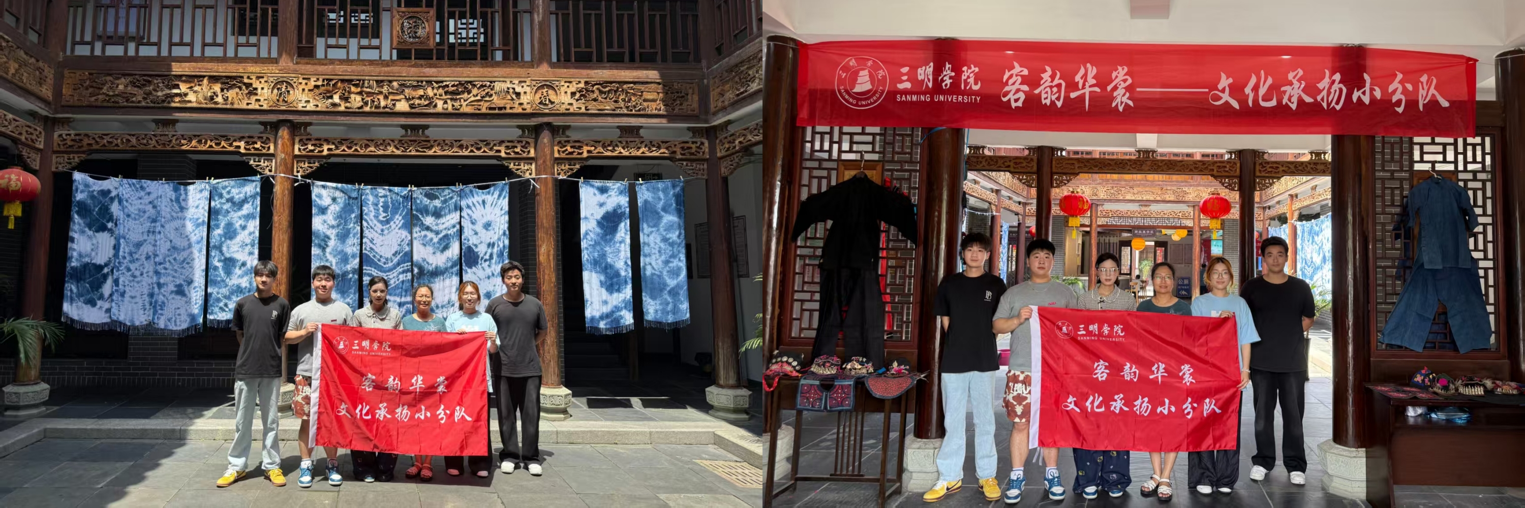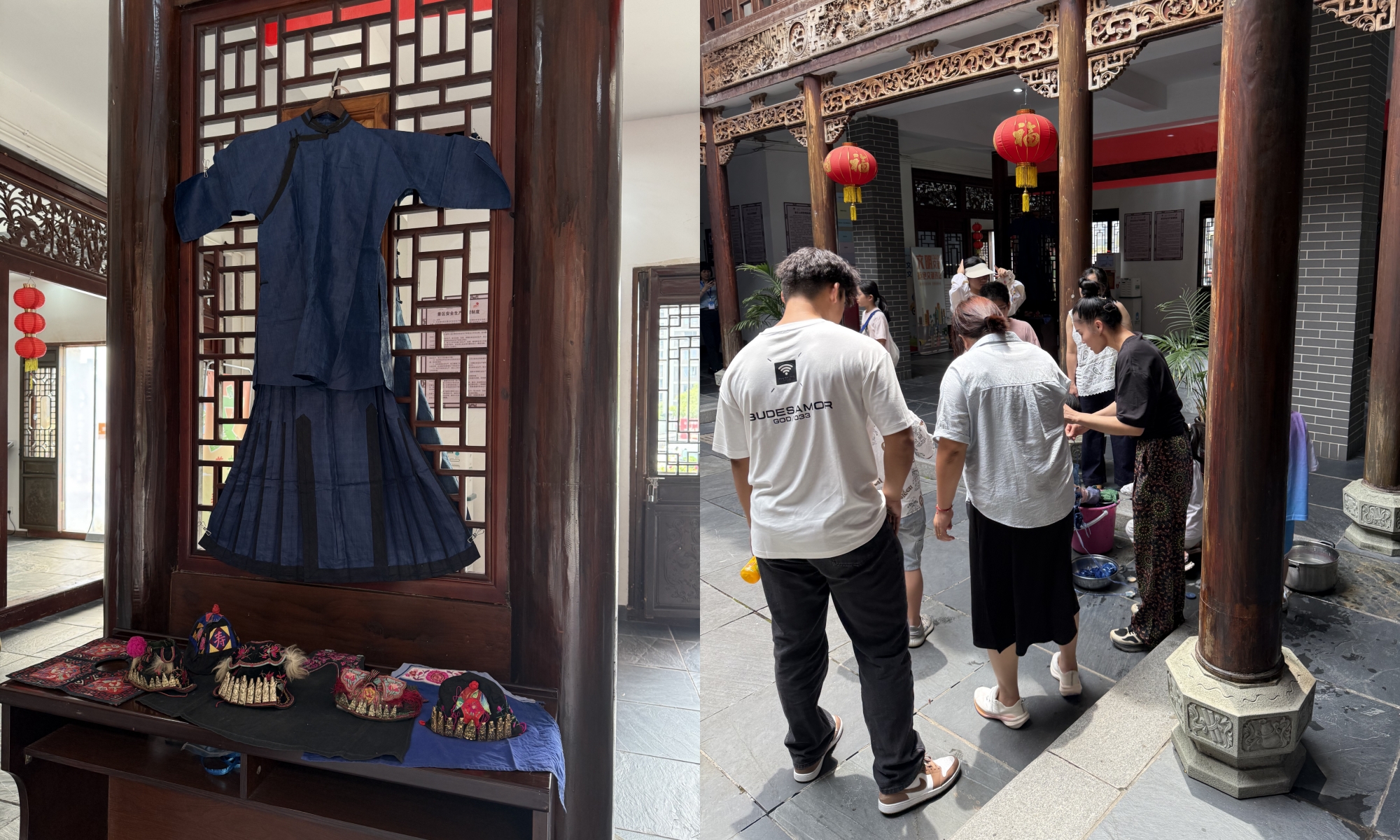 客家服饰承载着客家人的历史记忆与审美智慧,是中华优秀传统文化的重要组成部分。实践队选择沙县小吃城这一旅游地标,借助其客流优势推广客家文化,充分发挥“非遗+旅游”的积极作用。活动现场设置了服饰展示区和体验区,陈列了大襟衫、大裆裤、孩童围嘴等30余件客家传统服饰。队员们为游客讲解客家服饰特点和文化内涵,展示蓝染工艺从采蓝制靛到浸染晾晒的全过程,指导游客参与扎染围巾制作,增强互动体验。此外,活动还通过微信公众号、小红书、抖音等平台进行线上宣传,扩大客家服饰文化的传播范围。