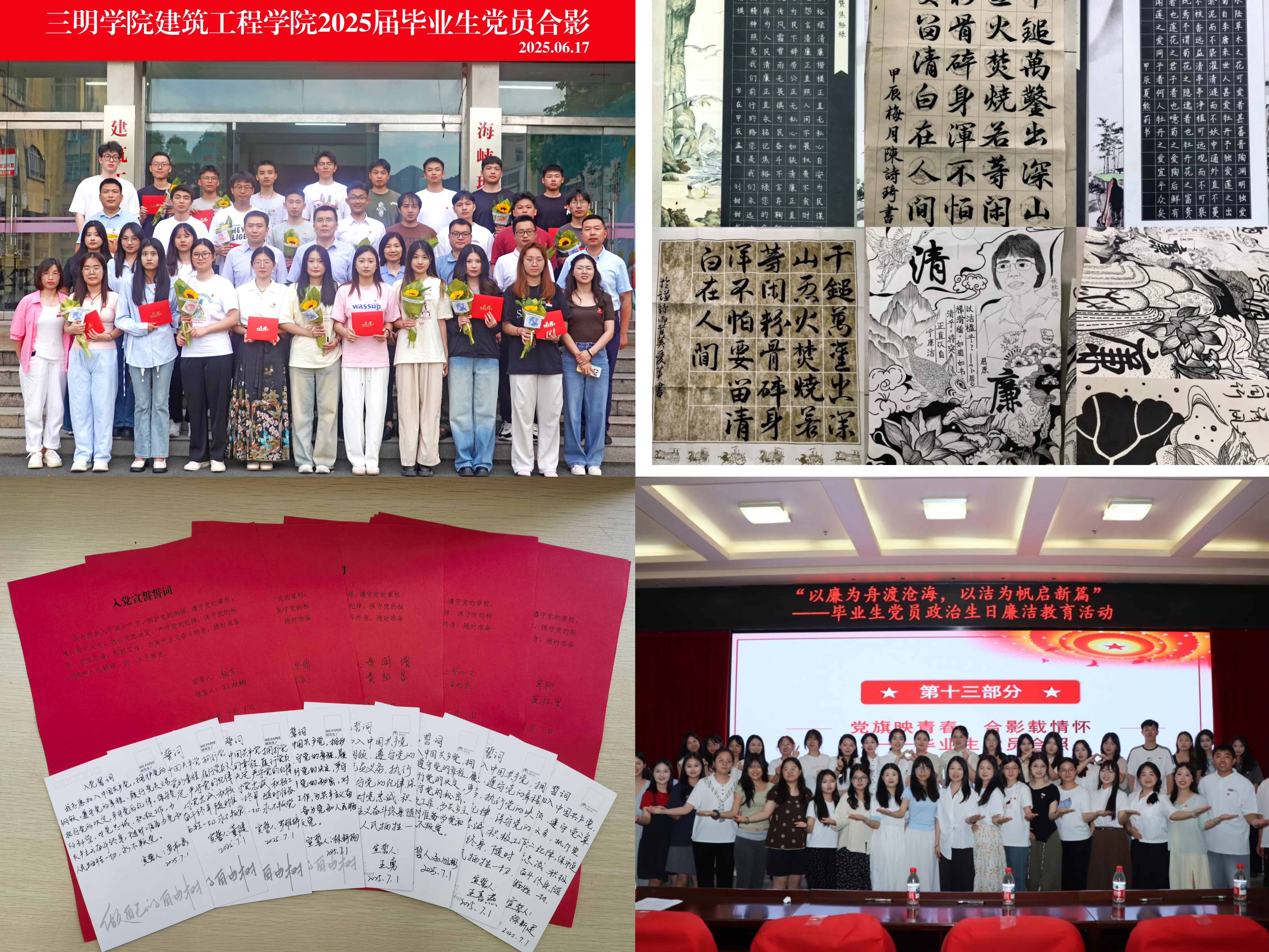 薪火相传担使命,青春向党启新程。“以廉为舟渡沧海,以洁为帆启新篇”,教育与音乐学院党委开展廉洁教育活动,寄望毕业生党员以清正廉洁的政治本色和过硬作风,在新的征程中书写更加辉煌的篇章;体育与康养学院举办“青春向党·逐梦起航”毕业季主题党日活动,组织全体毕业生党员签订《廉洁承诺书》;建筑工程学院党委勉励全体毕业生党员在新的征程上“行稳致远,不忘来时路”,“请党放心,强国有我”的铿锵誓言在党徽映照下回响,激励着每一位党员奋勇前行。