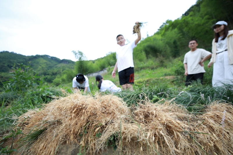 7月7日,志愿者们与“护苗学堂”的孩子来到罗坊乡左拔村,满眼绿油油的麦冬地里,下脚都困难。志愿者和孩子们找了一块平整些的地方,双脚趟进地里,双手握住麦冬根部用力一拔,一串串麦冬被连根拔起,轻轻抖动根系,窸窸窣窣的沙土从根部落下,一颗颗纺锤形、米黄色的麦冬粒呈现在眼前,在阳光下肉嘟嘟的,惹人喜爱。