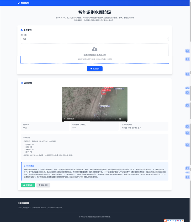 针对这些痛点问题,青年们迅速开启技术攻关。他们以YOLOv8算法为核心,结合Django全栈技术,搭建出操作便捷的“智能水面垃圾识别”网页平台,并同步接入火山方舟AI大模型,实现水域垃圾智能化、精准化识别。使用时只需导入无人机拍摄的水域影像,系统便能自动完成垃圾数量统计、种类分类,生成包含清理优先级、工具建议的处理方案。原本需人工耗时数小时的水域排查,如今通过智能平台几分钟内即可完成,治理效率与精准度实现质的跃升。