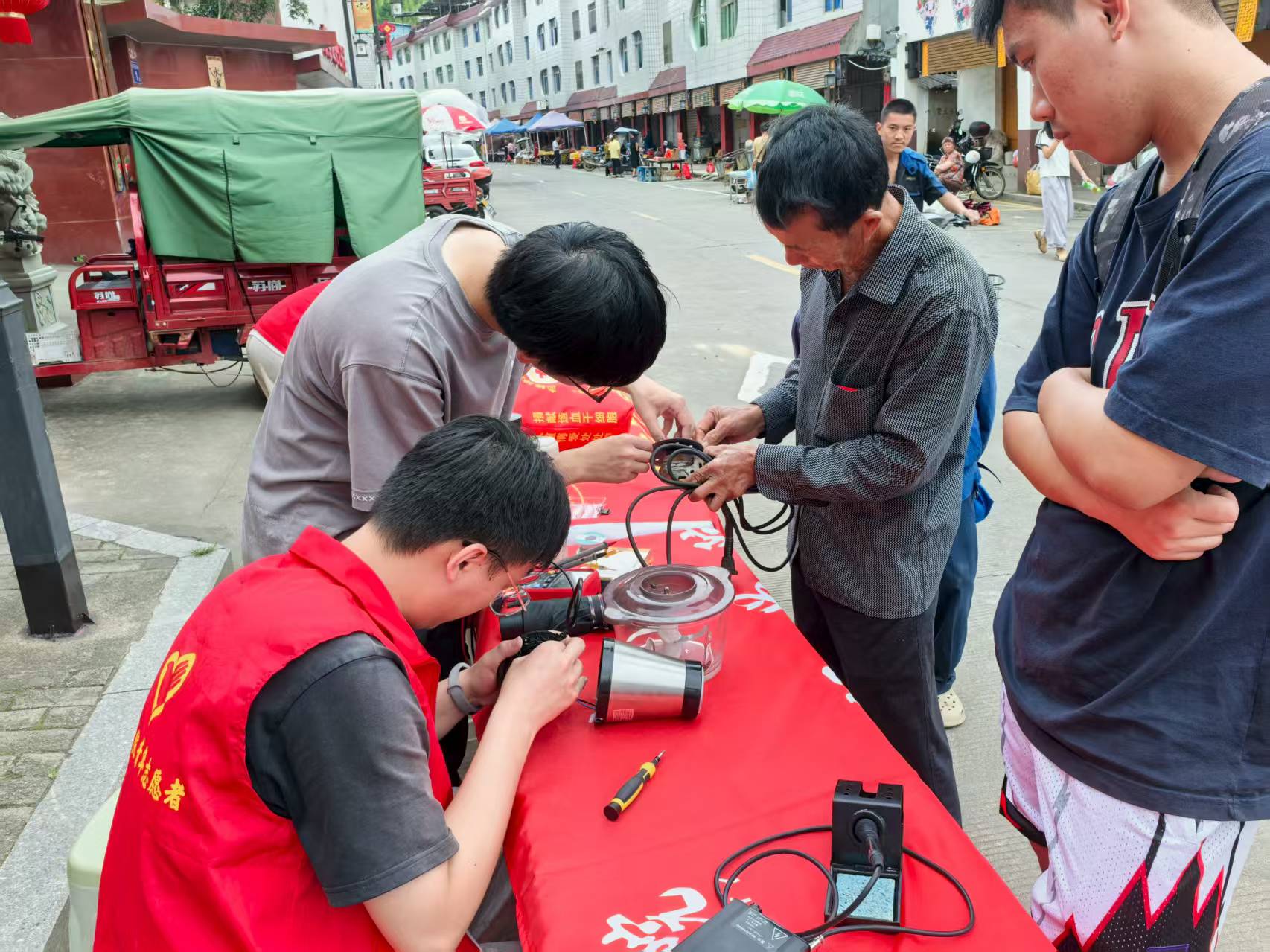 在青水乡政府支持下,志愿队在乡政府门前设立临时维修点,吸引了许多周边村民携带电风扇、电饭煲、收音机等故障电器前来维修。志愿者们依托专业知识,熟练运用万用表、电路检测仪等工具细致排查电器故障,并向村民传授家电保养技巧,如清洁电风扇电机积尘、避免电饭煲内锅碰撞变形等。