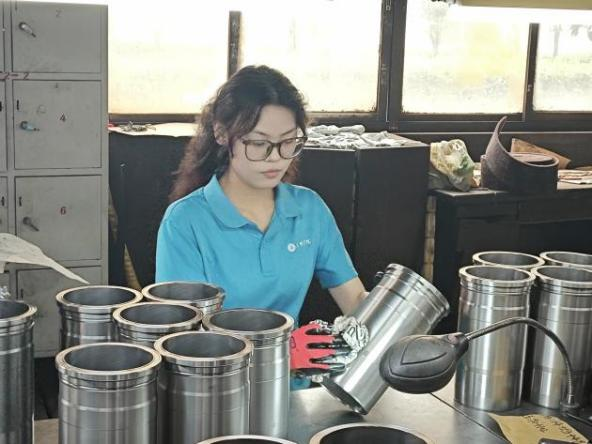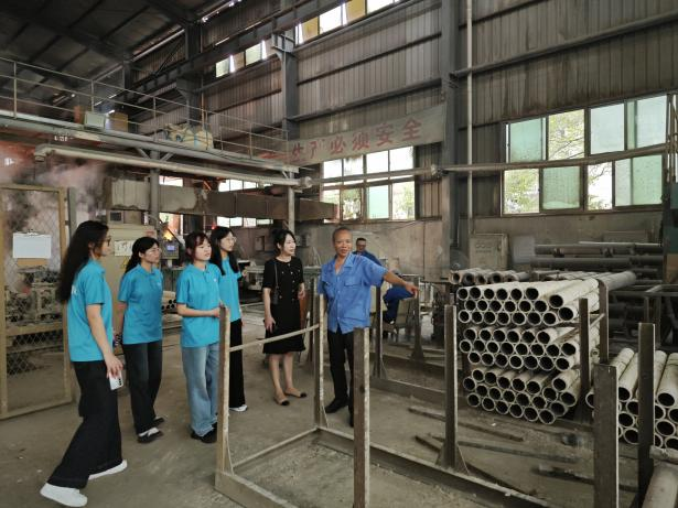实践团来到福建汇华集团,在企业负责人的热情引导下深入生产车间。大家围绕生产工艺优化、设备智能化改造、绿色生产技术应用等问题,与企业技术人员展开深入交流。在车间技术人员的指导下,团队成员亲身体验了气缸套生产流程中,擦气缸套的工序。“原来看似基础的工序里藏着这么多门道,每一个细节都影响着产品质量。”实践团成员赖小燕一边仔细擦拭,一边感慨道。