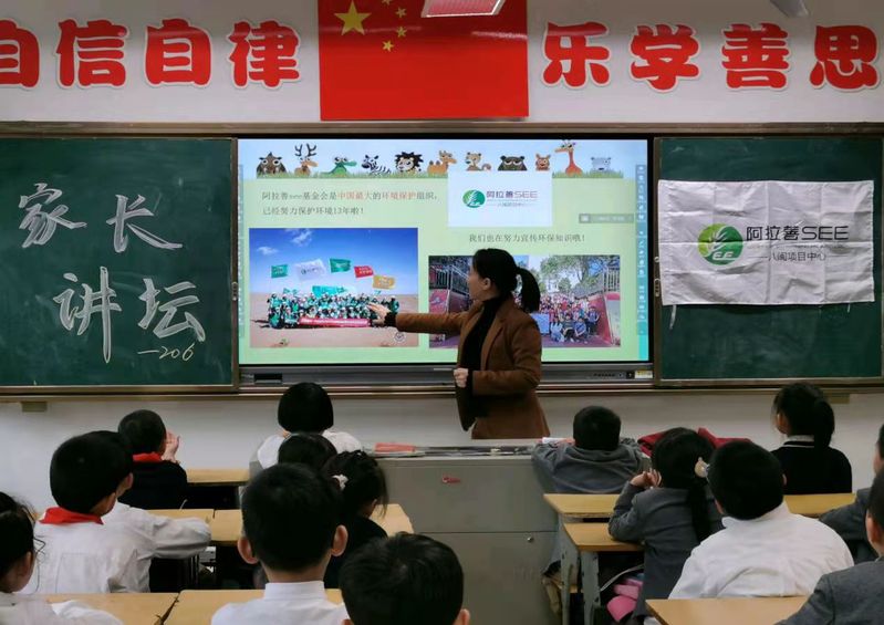 公益讲师杨红梅以生动有趣的形式先向小朋友们介绍了阿拉善这一聚焦荒漠化防治、栖息地保护、公众环境与健康、环保公益行业发展领域为宗旨的公益组织,并呼吁大家做出行动,为保护环境贡献自己的一份力量!