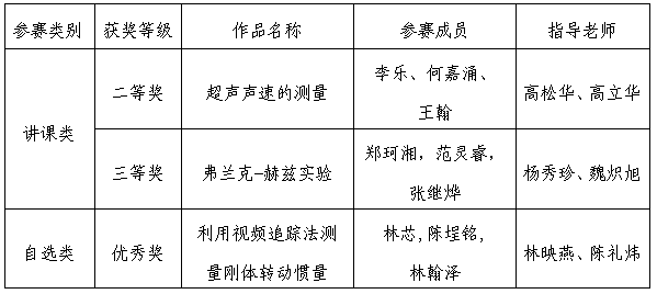 据悉,此次竞赛共有全国667所高校、2755支队伍、15715名师生报名参赛,280所高校的548支队伍共计1400余名师生进入到现场决赛环节。共设置 命题类、自选类、讲课类(含校企合作)三个比赛类别。三项获奖作品分别是高松华、高立华老师指导的《超声声速的测量》,杨秀珍、魏炽旭老师指导的《弗兰克-赫兹实验》与林映燕、陈礼炜老师指导的《利用视频追踪法测量刚体转动惯量》。