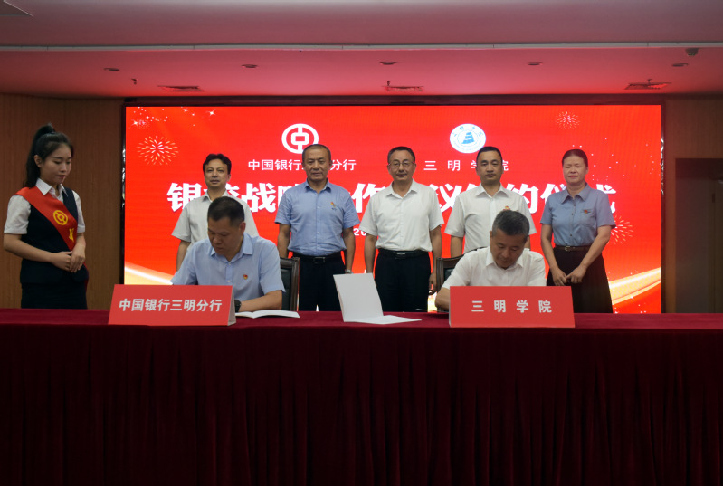 7月22日下午,yl6809永利官网与中国银行三明分行签订银校战略合作协议。中国银行三明分行陈志森行长、中国银行三明分行黄巧萍副行长,校领导赖锦隆、王乾廷、林建伟出席签约仪式。