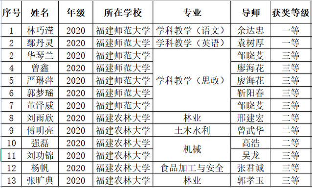 近日,福建师范大学、福建农林大学公布了2021年研究生奖学金评选结果,我校7名联培研究生获得福建师范大学研究生奖学金、6名联培研究生获得福建农林大学研究生奖学金。其中20级鄢丹灵、林巧滢获得福建师范大学一等奖学金,20级刘雨欣、强磊、傅明亮获得福建农林大学二等奖学金,其余8名同学获三等奖学金。