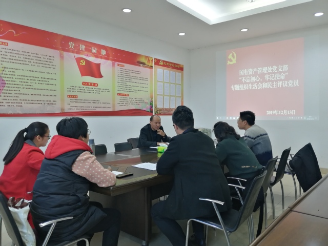 12月13日下午,国资处党支部召开“不忘初心、牢记使命”专题组织生活会和民主评议党员。国资处全体党员参加。
