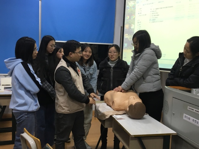 活动中,汤副主任结合实际病例,讲解了急救情形下,“黄金时间”采取心肺复苏(CPR)、海姆立克急救法等急救措施抢救病人的相关专业知识。同时,利用人体模型给师生们进行现场示范,向大家详细讲解了如何判断被救助者是否需要心肺复苏、心肺复苏的步骤、救助过程注意事项及判断心脏复苏是否有效的基本指征,并现场指导学生进行演示学习、实际操作。