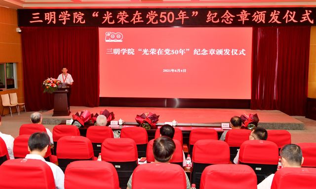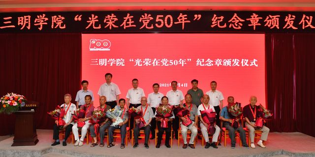 6月4日,我校举行“光荣在党50年”纪念章颁发仪式。校党委书记兰明尚向老党员代表颁发纪念章,全体在家校领导及师生党员代表共同见证这一荣耀时刻。 “今天,我很荣幸地获得了‘光荣在党50年’纪念章,这是我生命航行中又一个新的里程碑,是我生命中的加油站”,有着55年党龄的老党员李长生动情感慨,“退休不褪色!我会继续发挥余热,为三明老年事业尽职尽责、尽心尽力。”新党员代表唐琳同学表示,作为新时代青年,将坚定理想信念,传承红色基因,锤炼品德、学好专业、练好本领,立志成为社会主义合格建设者和可靠接班人。 兰明尚表示,颁发“光荣在党50年”纪念章体现和传递了党对老党员的重视、关心,是一种光荣、一种致敬、更是一种学习。广大党员要牢记初心使命,深入思考“红色政权是怎么来的、新中国是怎么来的、今天的幸福生活是怎么来的”,在党为党、在党爱党、在党兴党;要赓续共产党人精神血脉,以老党员为榜样,把好的传统、好的思想和好的作风一代代传承下去,当好新时代接棒人;要紧扣强党强国的时代脉搏,坚定学校“三步走、创一流”的战略目标,以忠诚、实干、团结的行动为民族复兴大业作出积极贡献。 据悉,我校是三明市首批颁发“光荣在党50年”纪念章单位之一,全校共有21位老党员获此殊荣。此次纪念章的颁发,是中国共产党成立100周年庆祝活动的重要组成部分,颁发工作将一直持续到今年7月1日,全国将有710多万名老党员获颁纪念章。