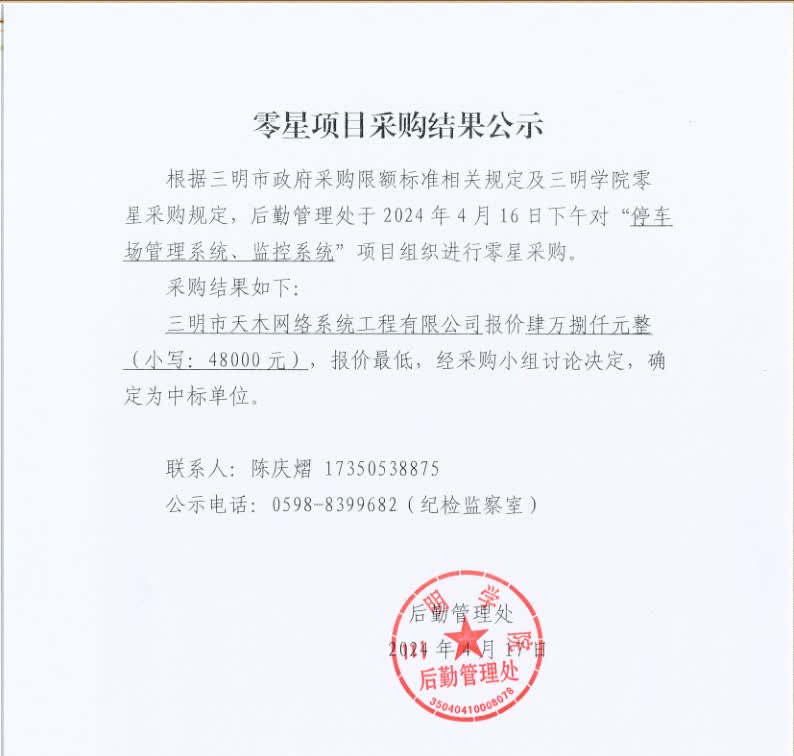 停车场管理系统、监控系统采购结果公示