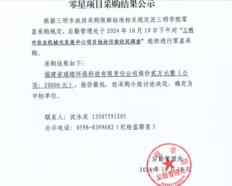 三明市农业机械化发展中心项目地块污染状况调查零星采购结果公示