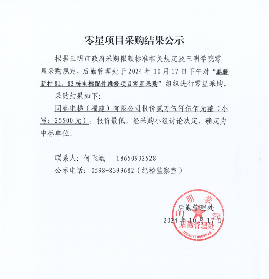 麒麟新村81、82栋电梯配件维修项目零星采购结果公示