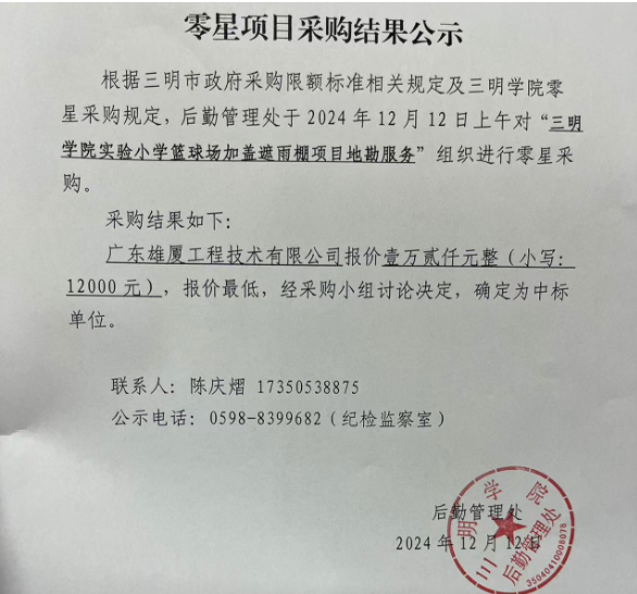 yl6809永利官网实验小学篮球场加盖遮雨棚项目零星采购结果公示