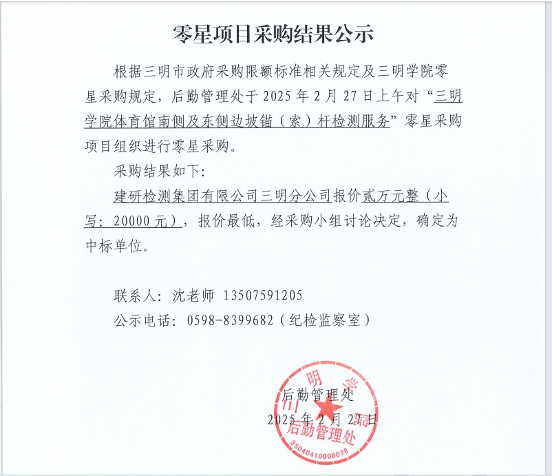 yl6809永利官网体育馆南侧及东侧边坡锚(索)杆检测服务零星采购结果公示