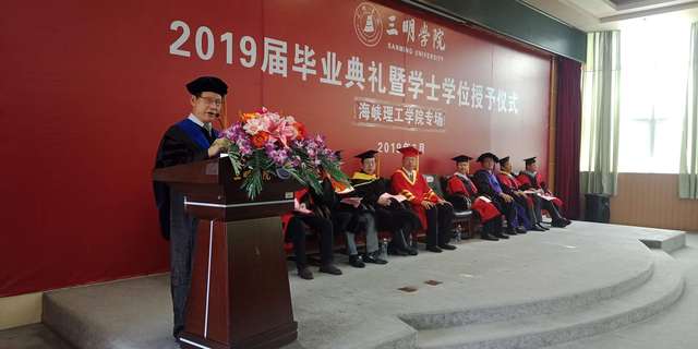 6月17日上午,海峡理工学院在图书馆学术报告厅举办2019届毕业典礼暨学士学位授予仪式。校领导刘健、林建伟,学工处、教务处负责人、海峡理工学院(台港澳办)及校内合作院系负责人、2019届毕业生、教师代表、家长代表参加了毕业典礼。台湾岭东科技大学董事长张天津、两岸交流处处长刘凯平、台湾中国科技大学教务处处长陈哲烱、台湾大叶大学工学院院长陈郁文、机械系主任纪华伟、台湾义守大学化工系主任洪志勳也专程前来参加毕业典礼。典礼由院党委副书记刘景苗主持。