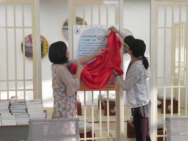 在庄重的拜师礼结束后,学院团委负责人与白沙小学团委负责人共同为“小海豚”书屋揭牌,并签署了校校共建协议。海峡理工学院团委负责人陈燕代表志愿者们将175本书籍目录交到了刘莉老师手中,志愿者们帮忙将书籍分类摆放到书架上。随后,双方就如何加深合作,开展共建活动深入交流,双方一致表示,阅读习惯的养成对于小学生来说至关重要,希望这批图书能够满足小读者们的需求,让孩子们爱上阅读,收获更多知识。
