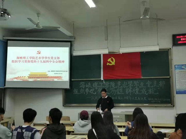 2019年11月27日晚上19:00,我院艺术学学生党支部于厚德楼111教室开展学习党的十九届四中全会精神专题学习会。参加会议的有支部全体在校党员。