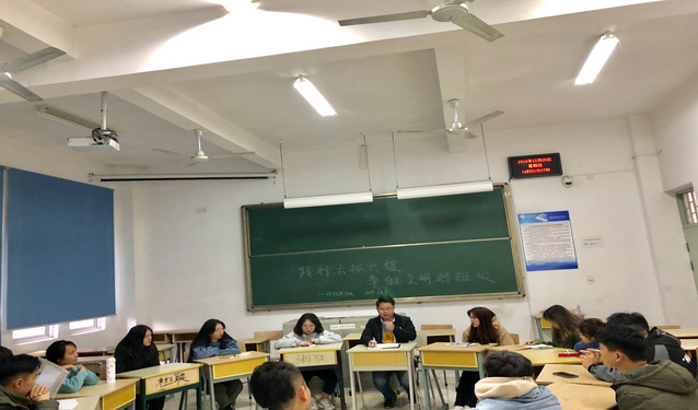 2019年12月5日15:00,我院19级视觉传达班级在厚德楼106教室举行以“践行六抓六促,争做文明好班级”的主题讨论会。参加讨论会的班级辅导员、全体班委、宿舍长。