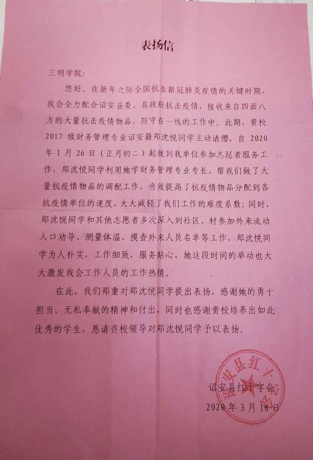 在郑沈悦的带动下,诏安县红十字工作人员热情高涨,在当地的疫情防控中起到了事半功倍的效果。为此,诏安红十字会专门给郑沈悦就读学校发来了感谢信,感谢她的勇于担当,她的无私奉献和付出。作为一名在家乡与祖国“同呼吸”的防疫志愿者,郑沈悦用她的真诚和汗水展现了明院学子的担当与奉献,展现了当代青年大学生的家国情怀,是明院学子榜样。