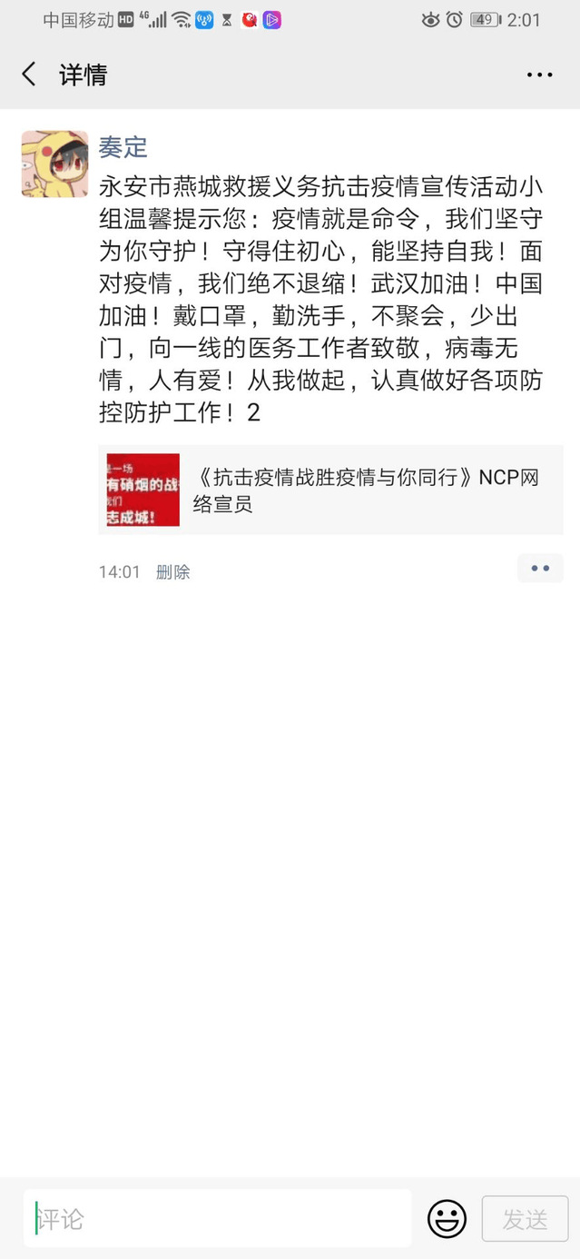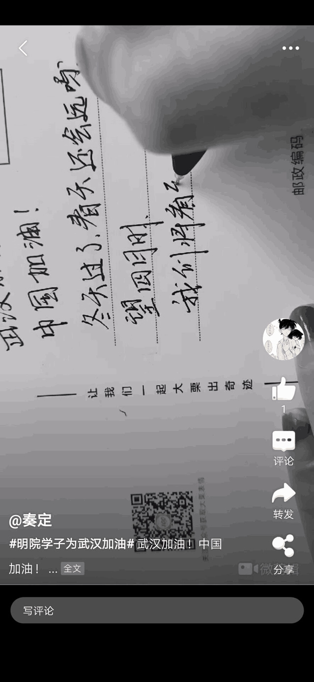 疫情当前,乐睿婕同学虽无法冲在最前线,但作为当代新青年,她在这个疫情最严峻的时刻,身怀大情怀,心系国家和人民,尽自己的微薄之力成为一名网络上的雷锋,为群众防疫作出贡献。正是有如明院学子乐睿婕同学这样的一大批新生代,我们才能更从容地应对并战胜疫情,迎接美好未来的到来。