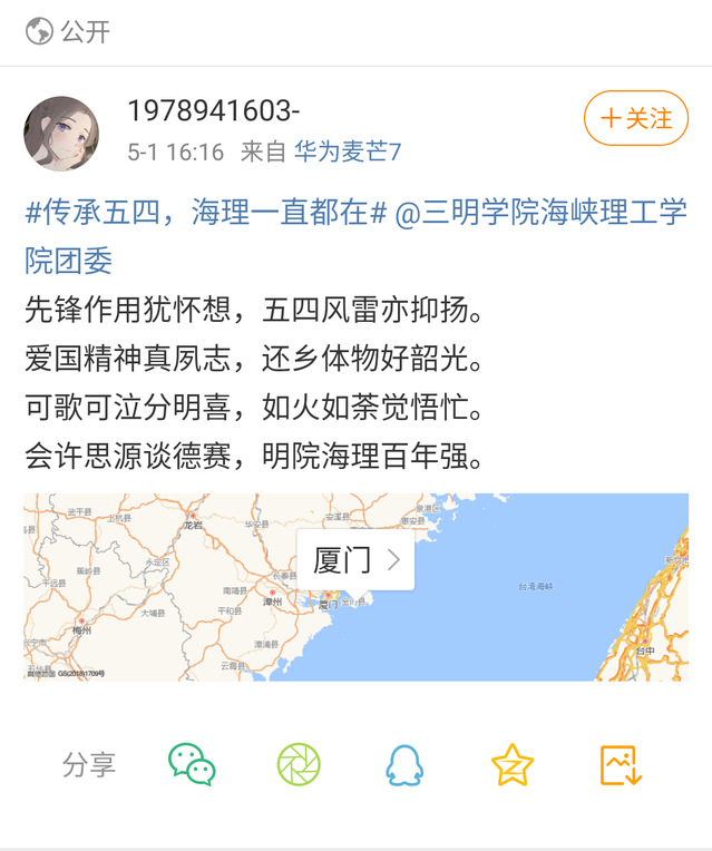 雨果曾说过:“谁虚度了年华,青春就将褪色。”所以我们需要努力奋斗,让我们的青春富有绚丽的光彩。海峡理工学院各个班级的宣传委员组织同学们发布#传承五四,海理一直都在#的话题微博,同学们发布的微博内容丰富多彩,展现了同学们不辱时代使命,不负人民期望的决心。