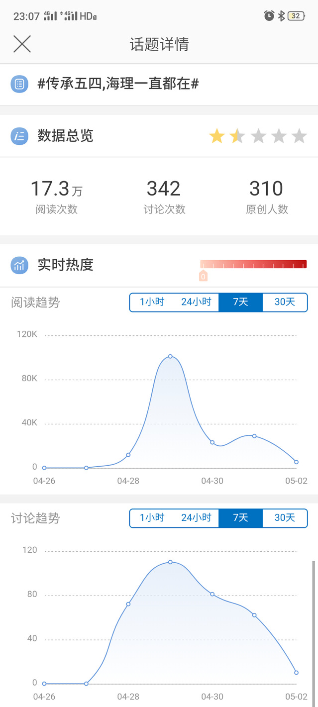 微博数据显示原创人数达到310人,阅读次数达到17.3万次,讨论次数达到342次。同学们的积极关注,五四运动虽然已经成为历史,但是五四精神却激励了一代又一代的有志青年。新一代青年要树远大理想坚守劳动作风,将劳动观落实到具体行动中去,将自己的个人梦想融入于实现中华民族伟大复兴的中国梦之中。