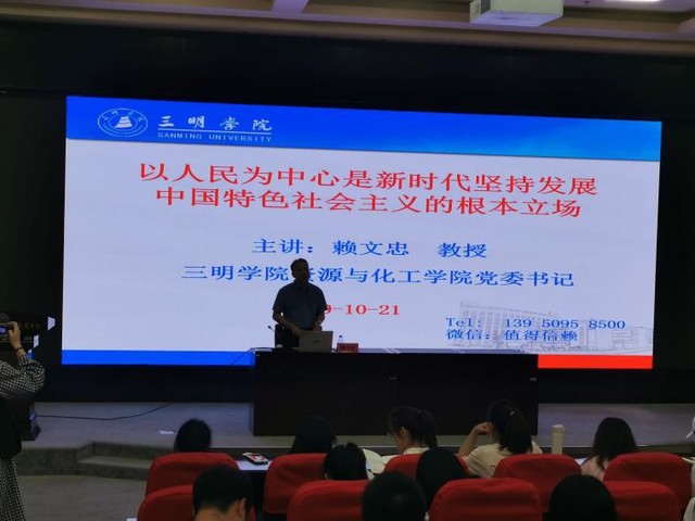 10月21日晚上六点半,我校赖文忠教授作为主讲人在图书馆学术报告厅开展了学习和发展新时代中国特色社会主义的讲座。该讲座的参加人员为文化与传播学院、海峡理工学院、资源与化工学院、艺术与设计学院。讲座分为四个部分:第一,正确认识坚持以人民为中心的重要地位;第二,深刻理解坚持以人民为中心的基本内涵;第三,全面落实坚持以人民为中心的实践要求;第四,贯彻党的治国理念到活动当中。