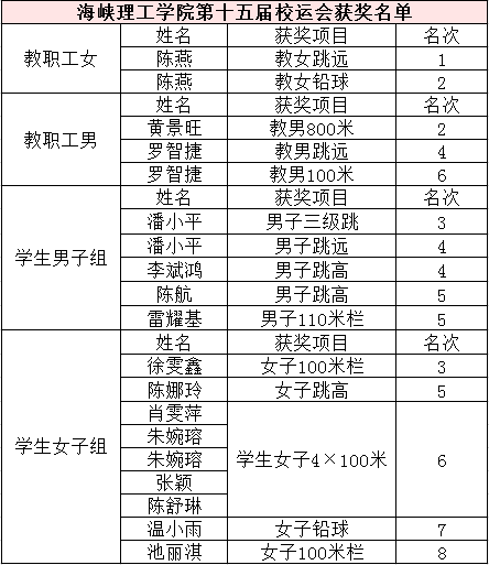 “谁说女子不如男”。这句话同样献给我院的女运动员们,在女子100米栏中,徐雯鑫同学获得第三名、池丽淇同学获得第六名好成绩。在女子跳高中陈娜玲同学获得第五名的好成绩,在女子400米中,方诺楠同学获得第四名的好成绩。在女子铅球中温小雨同学获得第七的好成绩。团体赛中,女生组在女子4×100米中取得第六的好成绩。