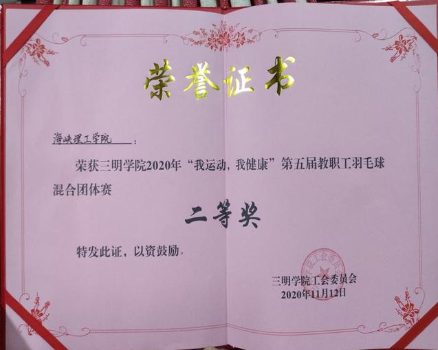 为弘扬体育精神,提高全校教职工身体素质,我校总工会积极响应习近平总书记体育强国的号召,于11月10日在南区羽毛球馆举办了“我运动,我健康”第五届教职工羽毛球比赛。本次比赛首先采用分小组单循环的形式进行,之后取每组前两名队伍采用交叉淘汰。一拍既出,谁羽争锋,我院教职工在赛场上团结一致,奋勇拼搏,充分发挥出自己精湛的个人技术和熟练的战术配合,赢得了场边围观群众的阵阵喝彩。经过四天的激烈角逐,我院教职工一路过关斩将,最终荣获了二等奖,这也创造了我院参赛历史的最佳成绩。