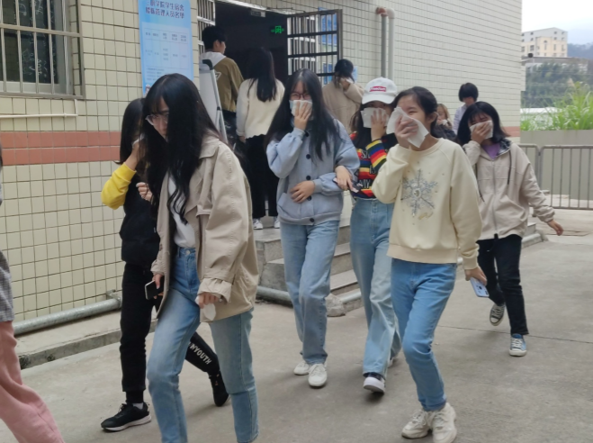 伴随着刘副书记一声令下,消防疏散演练正式拉开帷幕。同学们口捂毛巾,有序的撤离到宿舍楼下空地。