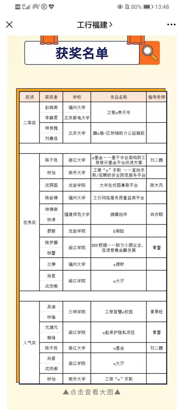 本次活动大赛分为注册、报名、上传作品、作品投票等四个阶段,我院的吴迪和林瑜同学通过针对不同高校定制符合该校园的云服务平台“工银智慧e校园”,历经层层筛选,在福建赛区的作品中脱颖而出,最终荣获最佳人气奖。
