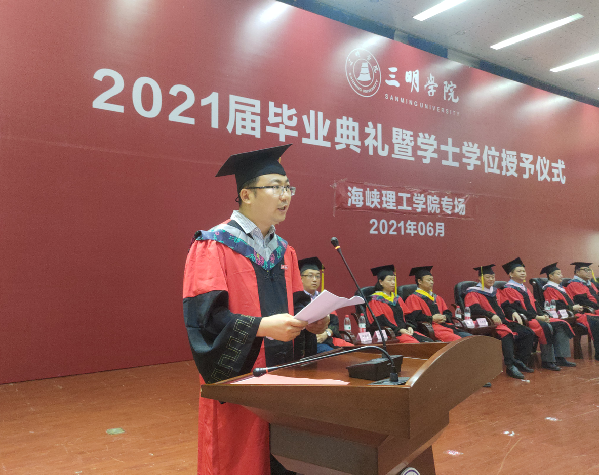 梦里春归去,榴花晚欲然。6月23日上午,海峡理工学院在行政楼附楼学术报告厅隆重举行2021届学生毕业典礼暨学士学位授予仪式。校党委委员、副校长林建伟教授,学生工作部(处)、教务处、合作学院党政负责人及教师代表、海峡理工学院全体教职工、2021届全体毕业生及学生家长代表参加此次毕业典礼。毕业典礼由学院党委副书记陈勇主持。