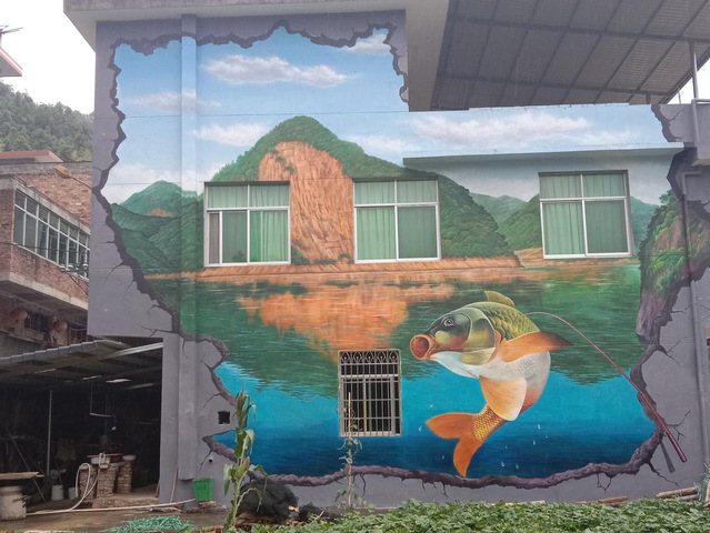 高才村墙绘主题,主要围绕当地“七星湖”景观、北上抗日先遣队以及民风民俗进行设计施工。实践团队此次负责“七星湖”风景绘画,绘画内容与高才村整体环境融合一体,受到乡镇领导以及村民的肯定和认可。
