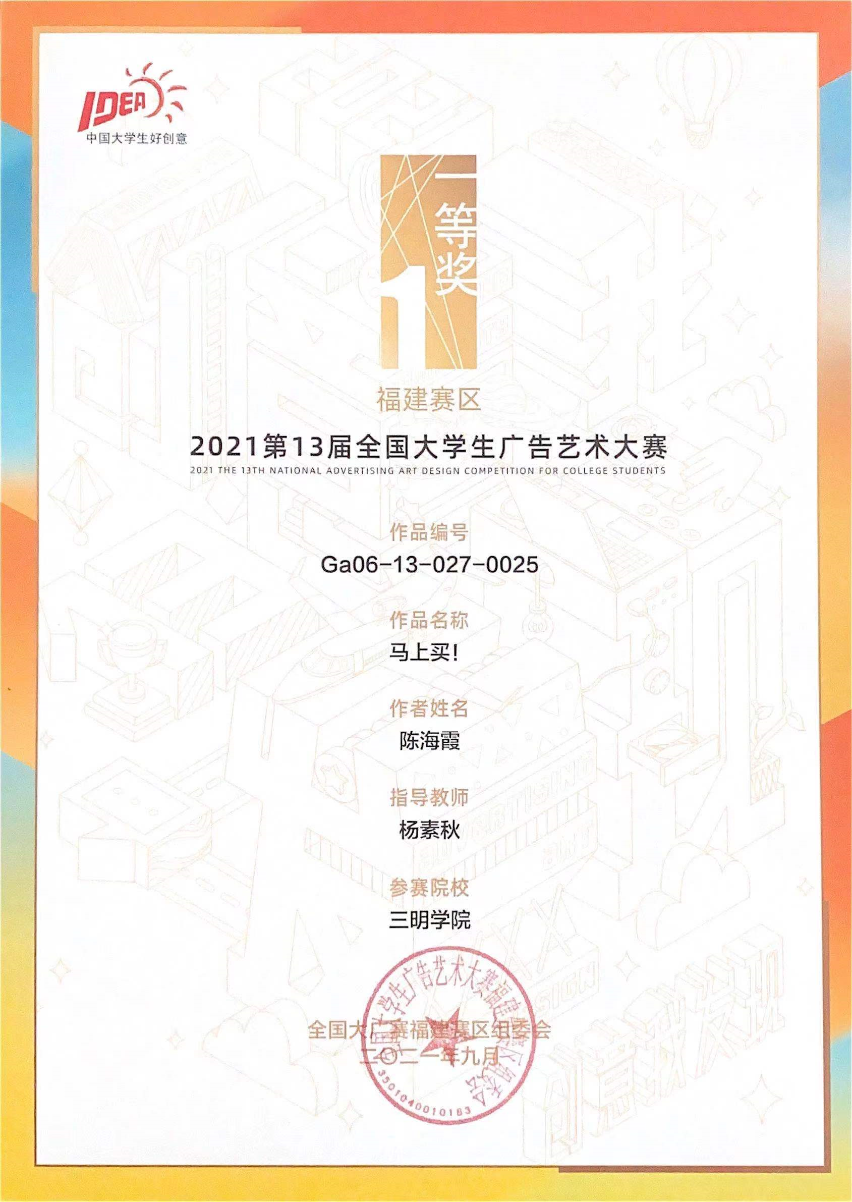 据悉,全国大学生广告艺术大赛是由教育部高等教育司指导,中国高等教育学会、教育部高等学校新闻传播学类专业教学指导委员会共同主办的全国高校文科学科竞赛,也是迄今为止全国规模最大、覆盖高等院校较广、参与师生人数多、国家级大学生赛事。大广赛旨在提高大学生的创新精神和实践能力,激发大学生的创意灵感,为优秀人才脱颖而出创造良好的竞赛平台。