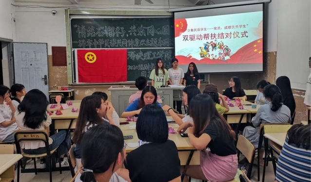 支部成立了“少数民族学生——党员、成绩优秀学生”双驱动帮扶结对小组,从学习辅导、生活关怀方面对少数民族学生进行“二对一”精准化帮扶。党员郑思仪同学作为帮扶少数民族学生的代表,她表示:“少数民族学生是学校多元有爱大家庭的重要组成部分,作为一名学生党员,我将不负守望,与少数民族学生手挽着手、肩并着肩,牢固树立坚定的民族团结意识和中华民族命运共同体意识,相互理解、相互尊重、相互帮助、共同成长。”