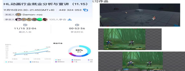 2022年11月15日晚,学院邀请厦门“触控创新班”项目负责人高玉霞老师、2018级部分校友在线为2019-2022级动画专业学生普及就业知识、讲解行业动态。高玉霞老师从动画行业发展趋势、国家支持政策、动画产业人才需求的角度入手,介绍了“触控创新班”的历史与人才培养模式;2018级优秀校友,厦门“触控创新班”学员颜煜杰、郑志攀则现身说法,从学习经历、行业选择、岗位薪资、发展前景等方面介绍了自己的成长历程。对于“全新”的课堂培养方式,同学们兴致满满,纷纷在线提出各种问题,“触控班”老师和学长们耐心地逐一为学生们答疑解惑,扫除迷茫,并留下自己的联络方式,方便学弟学妹们活动后进行咨询。