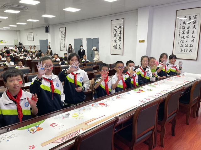 活动接近尾声,志愿者组织同学在长轴画卷上印下了自己的小手印,写下自己对党对国家的祝愿。这不仅加强了红色文化教育,更让同学通过自己的实际行动践行了爱国主义精神。