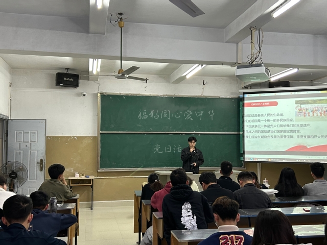 为进一步贯彻中央民族工作会议和省委民族工作会议精神,切实提高支部成员对铸牢中华民族共同体的思想认识。3月26日,工学学生党支部于理工三407开展“福籽同心爱中华”主题党日活动。本次活动由支部书记罗智捷主持,全体在校学生党员、入党积极分子参加本次活动。