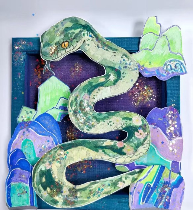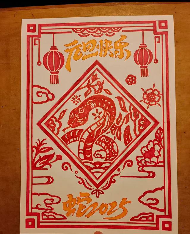 各位同学的作品从卡通可爱风到神秘写实风,风格各异的蛇形象在同学们的笔下逐渐鲜活,有些用鲜艳的色彩大胆涂抹,有些则注重细节与意境的营造,精心描绘蛇身上的鳞片,一片一片,排列整齐而富有层次感。为了突出“金蛇狂舞”的主题,他们还用流畅的线条表现出蛇灵动的身姿,仿佛正在欢快地舞动迎接新年的到来,展现出了较高的绘画技巧和丰富的想象力。巧妙地将金蛇与新年元素如鞭炮、福字、梅花等相结合,寓意吉祥。