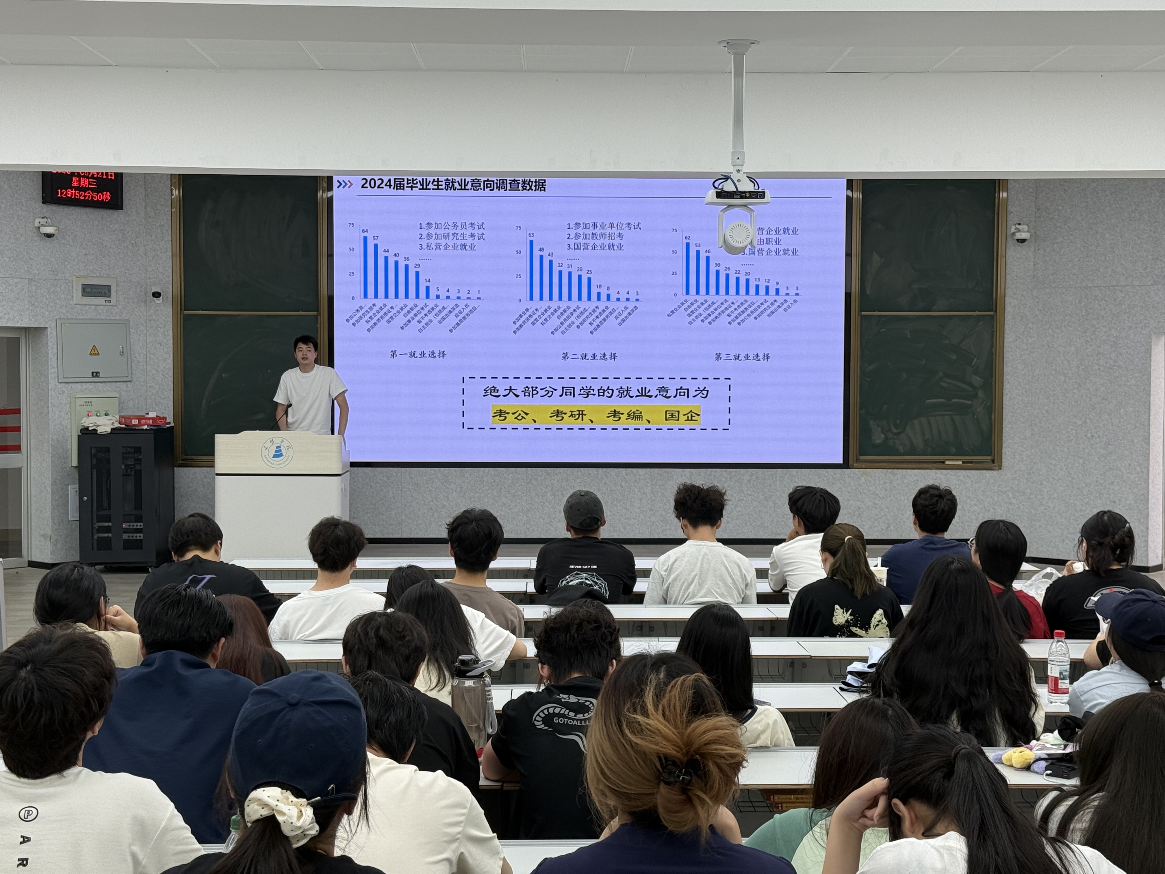 讲座结合学院近三年毕业生就业意向调查数据和毕业去向情况,用一系列详实的数据帮助同学们直观了解学长学姐的就业情况。面对当下复杂多变的就业环境,主讲人深入剖析当前就业形势,聚焦人工智能浪潮对行业人才需求带来的变化,希望同学们要珍惜大学时光,树立正确的价值观、提升专业能力、练就过硬本领。在政策性岗位专题模块,主讲人逐一解读选调生、三支一扶、志愿服务乡村振兴计划、西部计划等基层项目,结合往届优秀校友扎根基层的典型案例,鼓励同学们将个人理想融入国家发展大局,书写精彩的人生篇章。