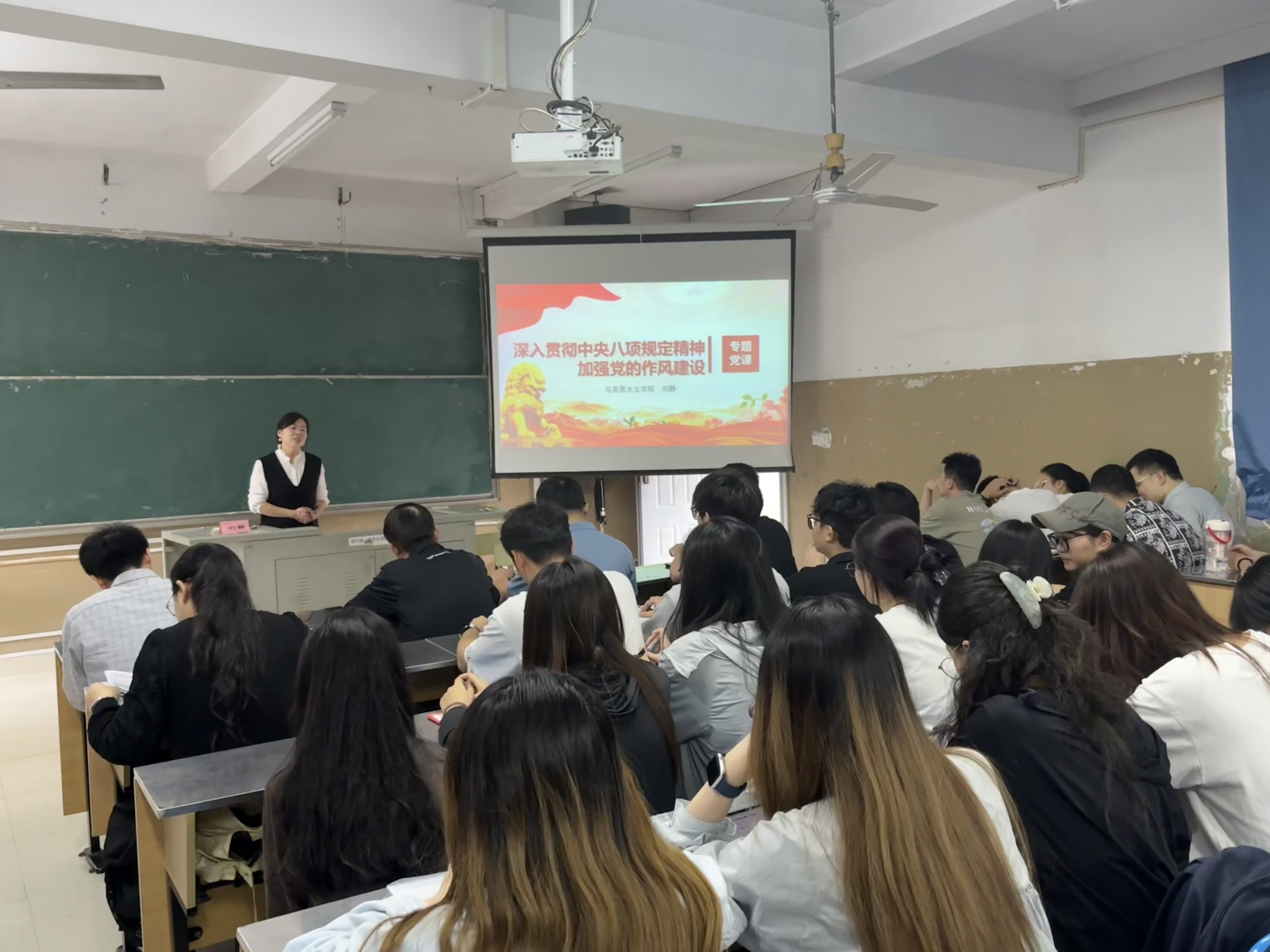 马克思主义学院刘静老师作题为《深入贯彻中央八项规定精神,加强党的作风建设》的专题辅导报告。刘静老师深刻阐释了中央八项规定精神的重大意义、核心要义与历久弥新的实践价值,紧密联系高校立德树人根本任务和学院工作实际,深入剖析了当前作风建设面临的新形势、新挑战,强调作风建设永远在路上,必须常抓不懈、久久为功,以优良党风引领校风、教风、学风建设,共同营造风清气正的育人环境。