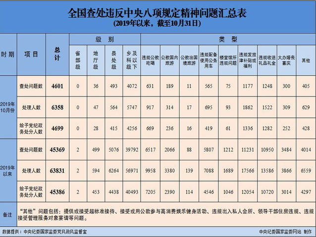 为掌握全国贯彻落实中央八项规定精神情况,中央纪委国家监委在各省区市和新疆生产建设兵团、各中央和国家机关、各中央企业和中央金融企业等建立了落实中央八项规定精神情况月报制度。2019年以来,截至10月31日,全国查处违反中央八项规定精神问题情况如下: