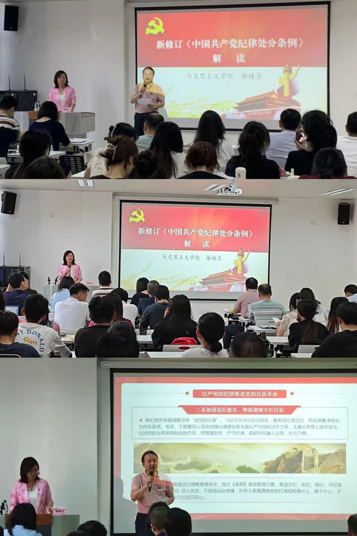 徐桂兰教授从深刻领会《条例》修订的重要意义、准确把握《条例》修订的主要内容以及切实抓好《条例》的学习贯彻,以严明的纪律推进党的自我革命等三方面作专题辅导。整场报告内容丰富,既有《条例》修订内容的对照解读,又有结合《条例》学习的典型警示案例,对进一步教育引导师生党员干部该做什么、不该做什么,能做什么、不能做什么,深化对《条例》的理解运用,把遵规守纪刻印在心,做到学纪、知纪、明纪、守纪,切实做到把他律要求内化为自觉行动,对推进党纪学习教育走深走实有重要的指导作用。