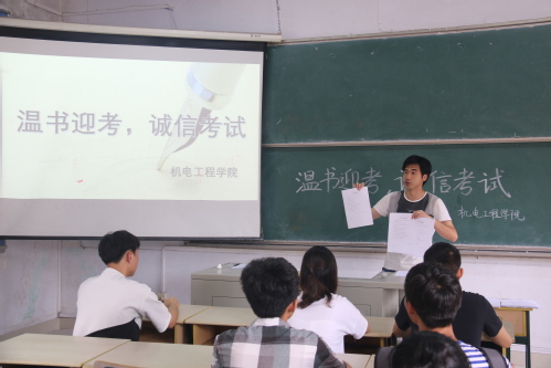 为进一步加强学风建设,营造良好的期末复习考试氛围,加强大学生诚信教育,严肃考风考纪。5月27日,在期末考试来临之际,机电工程学院在理工一315组织开展“温书迎考,诚信先行”主题教育活动。