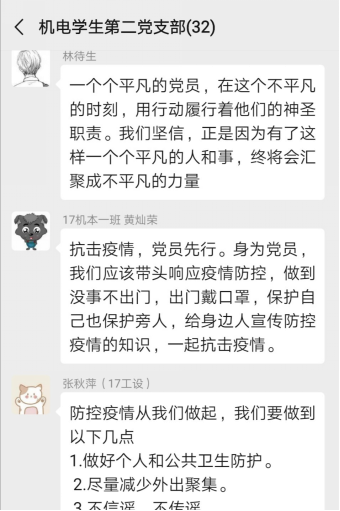 每位党员通过分享承诺书与学习心得体会,在微信群开展讨论。党员们针对学习内容谈出了自己的感想及作为党员在疫情防控期间应当承担的责任,为打赢疫情防控阻击战打下了坚实的思想基础。
